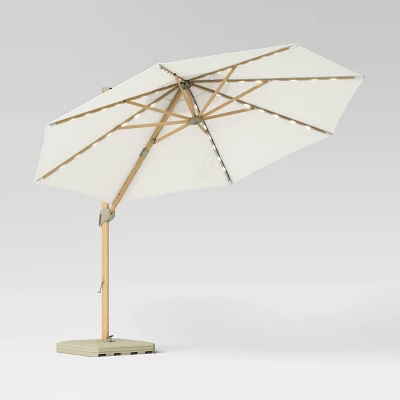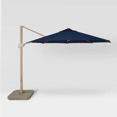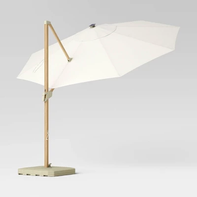 This 11-Foot x 11-Foot Offset Solar Outdoor Market Umbrella from Threshold™ will put the perfect finishing touch on your patio decor. Made with fade-resistant fabric in a solid hue, this outdoor umbrella features an offset canopy and is constructed with a steel frame and a light wooden pole. It’s compatible with cantilever umbrella bases (sold separately) and can be assembled without the use of any tools, and the crank lift makes the canopy easy to open and close.