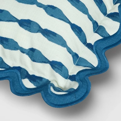 Liven up your decor with the nautical touch of this Scalloped Outdoor Lumbar Throw Pillow from Threshold™. This rectangular pillow has a textured faux-linen surface adorned with blue stripes and scalloped flange trim with embroidered accents for a lovely look. Designed with a polyester fabric exterior and polyester fiber filling, this indoor/outdoor pillow boasts UV-, weather-, water- and fade-resistant properties for worry-free use inside or outside of your house.