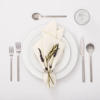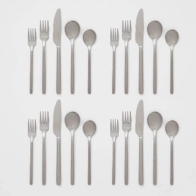 Elevate your dining table display with the sculptural style of this Stainless Steel Modern Straight Silverware Set in Satin from Threshold™. This stylish silverware set comes with service for four, including four each of dinner forks, salad forks, knives, dinner spoons and teaspoons to meet all your serving needs for everyday family dinners or hosting a dinner party. These stainless steel utensils have a satin finish for a modern look that will coordinate easily with any tableware or decor.