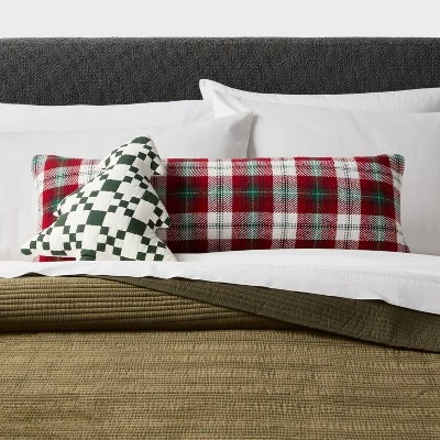 Add a festive vibe to your home decor with the Holiday Decorative Throw Pillow from Threshold™. This decorative throw pillow is designed in an oblong shape with allover plaid print for charming seasonal style. Made of 100% cotton fabric with 100% polyester fiber filling, this novelty throw pillow is finished off with sewn-seam closures for a neat look.