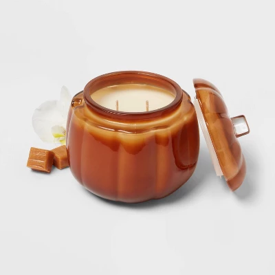Bring a touch of sweetness and seasonal charm to your space with the Lidded Glass Pumpkin Jar Candle from Threshold™. This 5-ounce candle is housed in a festive pumpkin-shaped glass jar with a coordinating lid, making it both a decorative accent and fragrant delight. With a bright, juicy peach scent, two wicks, and a burn time of approximately 15 hours, it’s crafted from a premium blend of palm and paraffin wax, making it perfect for cozy moments and autumn ambiance.