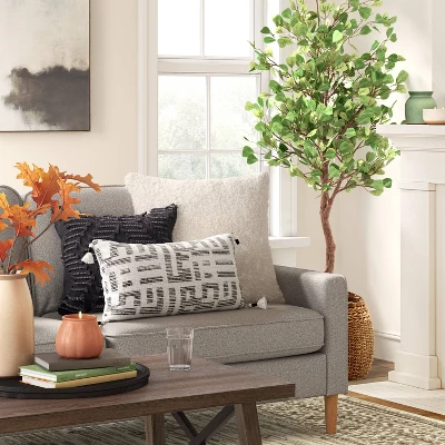 Make over your bedroom or living space with the contemporary charm of this Oversized Modern Geometric Patterned Lumbar Throw Pillow from Threshold™. Made of 100% cotton with soft filling, the rectangle throw pillow is adorned with an abstract geometrical pattern and features matching tasseled corners for a fun look. Whether you lounge in your favorite recliner, read a book on the couch or watch TV curled up on your sofa, you’ll love leaning on this oversized lumbar pillow.