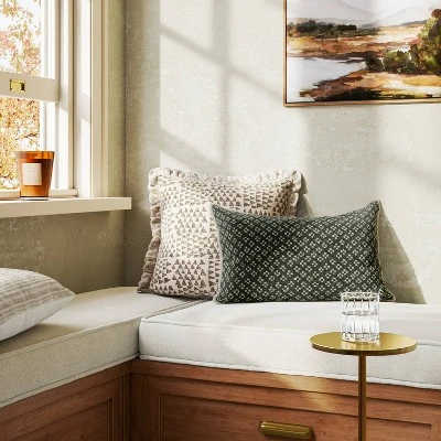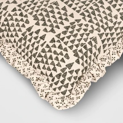 Elevate your seating or bedding ensemble with this Square Block Print Reversible Pillow with Ruffle Trim from Threshold™. This square throw pillow features a block-print cover with a floral pattern on the reverse and ruffle trim to add a pop of color and patterns to your seating. The soft cotton-blend exterior and polyester filling offer cushioned comfort, while the sewn-seam closure gives it a sleek finish.