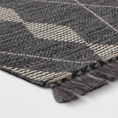 Make your outdoor space a little more welcoming with this Striped Diamonds Rectangular Woven Outdoor Area Rug from Threshold™. This rectangular woven rug showcases a striped diamonds pattern in a subtle tone with fringe detailing for a stylish look that blends effortlessly with any decor scheme. Made from polypropylene-blend material with a latex backing to help it stay in place, this flat-pile area rug is suitable for high-traffic areas like your entryway or patio — perfect for creating visual depth in your exteriors.