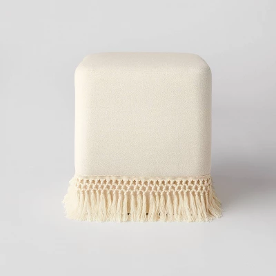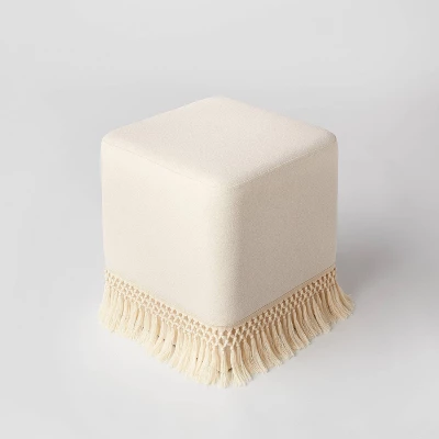 The Westchester Fringe Cube from Threshold™ designed with Studio McGee is an eye-catching boho accent with a purpose. This cube ottoman is small enough to slide out of the way when not in use, yet large enough to provide a place to rest your feet or use for spare seating. It is crafted with a wood frame and beautifully upholstered in a neutral hue with cool complementary fringe. Place it by an easy chair to put down your favorite book, or use two together for a place to rest a tray of snacks.